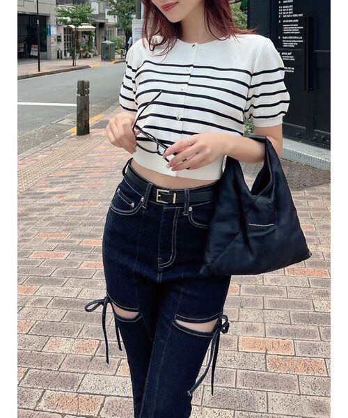 デニムにもピッタリ◎ショート丈のカーディガン ▽デザイン▽ パフスリーブが可愛らしいポイント。 フロントのボタンは小さめのゴールドボタンを付け上品さを出しました。 裾はリブ切り替えにしたことでウエストラインはすっきりと、 コンパクトなサイジングで肌見せコーデでトレンド感もUP! サラッと羽織ってカーディガンとしても、トップスとしても使える2WAY仕様♪ ▽カラー▽ 無地の黒・ピンク・ブラウンと 夏らしいボーダー柄の4色展開。 ▽スタイリング▽ ショート丈なのでハイウエストのボトムスと好相性! トップスとしても羽織りとしても活躍するので様々なシーンで活躍します。 ※着用画像はフラッシュの加減で実際の製品と色味等が異なる場合がございますので、生地のズームアップ画像をご確認ください。 ※ご利用の端末画面の設定により実際の商品と色味が異なる場合がございます。 【商品特徴】 透け感:なし 伸縮性:あり 生地の厚さ:普通 サイズ感:普通 裏地:なし ポケット:なし