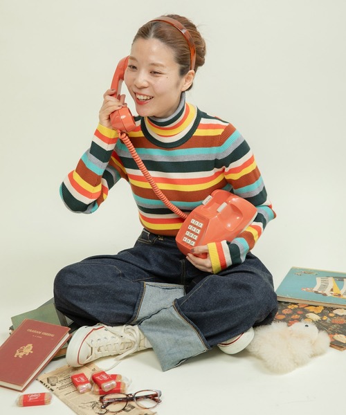 CHILD WOMANらしい元気でカラフルなカラーリングが目を引くタートルニット。もちもちとした質感が人気のレーヨン/ポリエステルの糸で編んだリブタートルニットを今年は配色やボーダーのピッチにこだわり、レトロな印象にお作りしました。ストレッチ性のあるナイロンを一緒に編んでいることで、キックバック(生地を伸ばした後に元の形に戻る力)が良く、型崩れしにくい素材感です。程よくフィット感もあり、形は女性らしくすっきりとコンパクトに着て頂けます。ウールが入っていないことで、チクチク感も少なくストレスのない着心地も嬉しいポイント。ご自宅で洗濯可能なので、肌に触れる面積が多くても気兼ねなくデイリーにお使頂けます。コーディネートの主役としてはもちろん、レイヤードアイテムのインナー使いとして、首元や袖からマルチボーダーをちらりと見せる着こなしもオススメです◎-----------------------透け感:なし伸縮性:あり光沢感:なし--------------------【素材の特性・お取り扱いの注意】・取り扱いの注意については取り扱い表示をよくご確認の上、着用をお願い致します。・素材の特性上、ピリング(毛玉)を完全に防止することは出来ません。ピリングが出来てしまいましたら、小さなハサミで丁寧に取り除いて下さい。毛玉取り機ご使用の際には、編地を切らないよう充分注意して下さい。※撮影画像は、光の当たり具合やモニターの環境により色味が違って見える場合があります。あらかじめご了承ください。※着用の商品はサンプルで撮影しております。お届けする実際の商品と仕様、加工、サイズが若干異なる場合がございます。