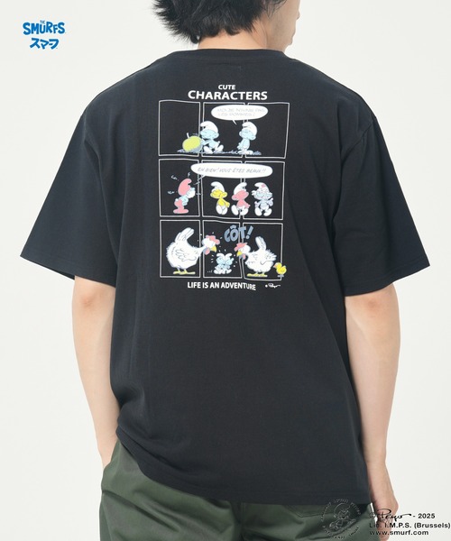 背面にコミック風のデザインが施されたTシャツです。 デザインには、フランス語のセリフとともに、かわいらしいキャラクターたちがユーモラスなストーリーを展開しています。 トップには「CUTE CHARACTERS」の文字があり、下部には「LIFE IS AN ADVENTURE」とのメッセージが描かれており、ポップで遊び心あふれるデザインが特徴です。 ユニセックスで着られるゆったりシルエットは、デイリーにも、おでかけにもぴったり。1枚で主役級の存在感を放つ、スマーフファン必見のアイテムです。 【The Smurfs/スマーフ】 ベルギー生まれの青い要請。 「スマーフ」は、誰も知らない森の奥に住む青い小人たち。 背の高さはリンゴ3つくらい。 白い帽子に小さなしっぽ。 スマーフの村には性格や役割の異なる100人のスマーフたちが、住んでいます。 見た目はそっくりですが、性格はそれぞれ。 発明家、力持ち、へそまがり、くいしんぼう・・・と、 実は個性的で、長所も短所もありスマーフたちがお互いのことを思いやりながら、仲良く平和にくらしています。