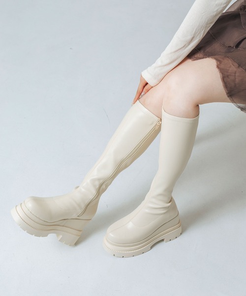 【EVOL 2025AW collection】履くだけでスタイルアップを叶えてくれる厚底ロングブーツ。今っぽいボリューム感のシルエットに、しっかりストレッチが効いた素材を合わせて美脚へ導いてくれる優秀アイテム!ふわふわ柔らかい中敷き入りで、長時間のお出かけでも疲れにくく安心◎約11cmの厚底ソールは見た目以上に軽量で、普段使いはもちろんライブやテーマパークへの着用にもおすすめ。【対応サイズ】XSサイズ:21~21.5相当Sサイズ:22~22.5相当Mサイズ:23~23.5相当Lサイズ:24~24.5相当【寸法(Mサイズ/23.5cm)】筒丈:37cm筒周り:最小22cm/最大32cm-----STAFF COMMENT-----【スタッフS】足長:右23.8cm・左23.8cm幅/ワイズ:標準・E甲:標準着用サイズ:Mコメント:靴下着用でMサイズがちょうどいいです。足幅が広めで甲も高い方ですが、意外と楽に履けました。ストッキングだと少しかかとが浮きそうになりますが、ブーツは靴下で着用するので靴下であればぴったり履けて歩きやすかったです。足幅が狭い方や甲が低めの方はワンサイズ下げるか、靴下の厚みや中敷で調節して、サイズ感はぴったりで着用する方が歩きやすくておすすめです。丈感は159cmの私でちょうど膝下くらいです。ストレチが効いていて足あたりが良く、美脚効果抜群です!【スタッフT】足長:右23.2cm・左23.4cm幅/ワイズ:やや細め・C甲:標準着用サイズ:Lコメント:私は足長が23.4cmですが、ゆったりした履き心地が好きなので24.0cmもしくはLサイズを選ぶ場合もあり、Lサイズが丁度良かったです。ストレッチが効いていて厚底なので足への負担も少なくて嬉しいです!スクエアトゥの足先なので、指先にもゆとりがあり快適に履けます。ボリューム感のあるソールが全体的なシルエットを可愛らしくしてくれるのでミニ丈と合わせたいです!※履き心地には個人差がございますので、あくまでも目安としてご覧ください。※商品画像はサンプルを使用しているため、色味やサイズ等の仕様に変更がある場合がございますので、予めご了承ください。【チャットで気軽に相談】InstagramのDMにて、気になる着用感や素材など、お気軽にご相談ください。動画・写真で詳しくお伝えすることも可能です!【EVOL/イーボル】instagram(evol_official0)レディース ブーツ ロングブーツ ストレッチロングブーツ 美脚ロングブーツ ストレッチ ラウンドトゥ 美脚 脚長 低身長 スタイルアップ 厚底 柔らかい ソフト 伸縮性 フィット感 カジュアル モード クール レディ ふかふか クッション入り 疲れにくい 歩きやすい デイリーユース お出かけ デート 旅行 女子会 ホリデー ライブ テーマパーク 韓国ファッション 小さいサイズ XSサイズ