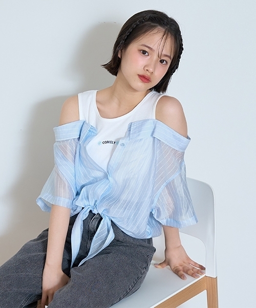 ヘルシーな肩見せが叶うレイヤード風のドッキングシャツです。 程よくシアー感のあるストライプシャツで、大人っぽい印象に仕上げました。 ウエストを結ぶとスタイルアップして見えるのもポイント。 一枚でさわやかなコーディネートが完成します。 刺しゅうの裏に「あて布」はございません。 Lovetoxic直営店でのお取り扱いはございません。 【透け感】透ける※インナータンクはやや透ける 【生地の厚さ】薄い 【伸縮性】なし※インナータンクは伸縮性有り 【裏地】なし 【ポケット】なし 【アジャスター】なし