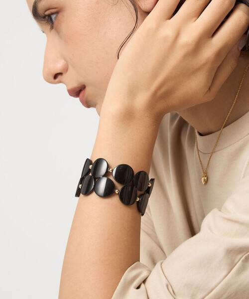 <Feeka>夏の装いに映えるアクセサリー■デザイン丸いモチーフが連なったデザインが可愛いバングル。軽装になるシーズンの手首のアクセントにぴったりです。※パーツを繋いでいるのは透明のゴムとなっており、比較的伸びが弱く、固めな仕様です。金具等は無く、そのまま手首に通して脱着するデザインです。※脱着の際は手首に沿わせるようなイメージで、無理に引っ張らないようにしてください。■素材アセテート(植物由来樹脂)============================ケア方法:・ご使用後は柔らかい布で汗や皮脂をやさしくふき取り、酸化を防ぐために、なるべく空気に触れないように保管してください。・アクセサリーは長時間付けず、汗をかいたらこまめに外してください。============================<Feeka(フィーカ)>Feekaは、エレガンスとシンプルさを融合させた、女性向けのアクセサリーを展開するフランスのブランド。洗練された美意識と品質へのこだわりを特徴とし、女性の毎日をスタイリッシュに彩ります。【注意事項】※化粧品や香水、洗剤、温泉、海水、紫外線などはジュエリーを傷める可能性がありますので、ご注意ください。※体質によりかゆみ・かぶれを生じた場合はご利用をお止めいただき、皮膚専門医にご相談ください。※商品を使用前に、タグ等に記載されている「取り扱い上の注意書き」、「洗濯表示」を必ずご確認ください。※商品画像は、光の当たり具合やパソコンなどの閲覧環境により、実際の色味と異なって見える場合がございます。あらかじめご了承ください。※商品の色味の目安は、商品単体の画像をご参照ください。・一部店舗・WEBストアでの限定展開となります。店舗へお問い合わせの際は、全国のgreen label relaxing各店舗まで下記の品名/品番をお申し付けください。品名:★FEEKA JAZZ BRC 品番:36333433064