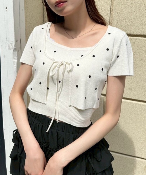 着るだけでこなれ感の出るセットアイテム ■デザイン ・大人っぽい印象のドット柄がかわいい、キャミとボレロのセット。 ・ボレロは短め丈&丸みのある袖で、甘さとバランス感を両立したシルエットです。 ・キャミはすっきりしたシルエットで、インナーとしても1枚着としても活躍します。 ・さらっと着れるサマーニット素材で、夏から秋にかけて長く着用していただけます。 ■カラー ・オフ/サックス/ブラックの3色展開 ■スタイリング ・デニムやスウェットパンツ合わせで、カジュアルダウンさせるのがおすすめ。 ・スカートを合わせてガーリーにまとめてもかわいいです。 ・キャミは他のカーディガンやシャツのインナーとして、ボレロはキャミワンピの羽織りとしてなど、着回し力抜群なアイテムです。 ----------------------------- 裏地:なし 光沢感:なし 透け感:なし 伸縮性:あり 手洗い:可能 タンブラー乾燥:不可 アイロン:110℃まで ----------------------------- model:161cm ※着用、お取り扱いの際は、商品についている品質表示とアテンションタグを必ずご確認下さい。 ※ご覧のモニター環境や撮影環境により実際の商品と多少色味が異なって見える場合がございます。ご理解の程よろしくお願いいたします。 ※引っかけ注意 ・粗い組織のものや、表面に凹凸があってルーズな組織のもの 表面に糸が浮き出ているものは、ちょっとした不注意から引っかけてしまいがちです。 取り扱いの際は取り扱い絵表示確認の上、十分注意してください。 ・着用時にベルトや、バックや周囲の壁など表面の粗いものとの摩擦や引っかかりに注意してください。 ・水洗いやクリーニングの際にも他の物ものとの引っかかりに注意して下さい。 ■お気に入り登録のおすすめ 【気になるアイテムを登録】 ハートをクリックしてお気に入りに登録すると 完売カラーの再入荷やラスト1点の通知、セールの通知を受けとることができます。 【ブランドを登録】 新商品や再入荷、セール通知など、いち早くブランドの情報を受けとることができます。