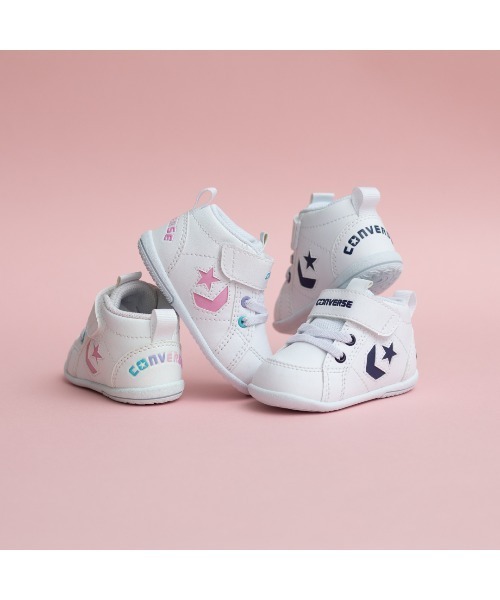 インファント向けのミッドカットモデル。 歩き始めの赤ちゃんのために、ソフトな合成皮革を使用しており、足に優しい履き心地を実現。 また、軽量で屈曲性に優れたソールを採用し、足の自然な動きをサポート。 ベルトタイプに踵ループ付きで、履かせやすさも抜群。 MIDカットデザインは、足元をしっかりとサポートしてくれるので、ファーストシューズにもおすすめの一足。 ホワイトベースにパステルトーンのマルチカラーを落とし込んだホワイト/ピンク/ライトブルー(ホワイト/ピンク)と、シンプルにまとめたホワイト/ネイビーの2カラー展開。