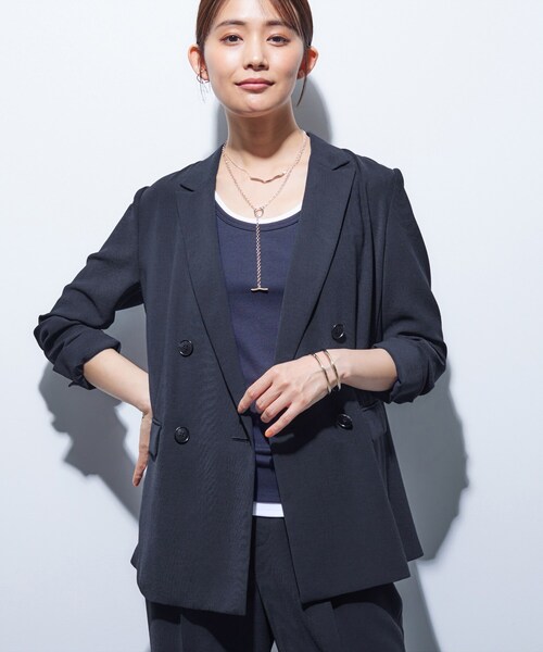 【デザインポイント】ナチュラルな表情で程よい落ち感のある素材を使用し、リラックス感がありながらも、キレイめな印象のダブルジャケットです。サイズ感は大きすぎず、衿も細身のすっきりとしたデザインなので着やすく、あらゆるトップスに羽織りやすいアイテムです。コートよりも軽く、シングルジャケットよりも抜け感のあるアウターです。【スタイリングポイント】日常の中で気負わずに着られるカジュアルなダブルジャケットは、お洒落の幅を広げてくれます。羽織るだけでお洒落見えするので、Tシャツやブラウス等どんなアイテムとも好相性です。同素材のパンツ合わせはもちろん、ワンピースの上に軽く羽織るスタイルもおすすめです。【セットアップアイテム】セットアップとして着用いただける下記のアイテムをご用意しています。ワイドパンツ:127-61050【素材ポイント】適度な落ち感を持ったヴィンテージ感のあるナチュラルな表情が特徴の素材になります。適度なストレッチ性を持ったリラクシーな着心地に、シワになりづらいイージーケア性/遮熱性/UVケア性/吸水速乾性も兼ね備えた素材になっております。【仕様】・ポケット数:横×2・裏地なし※この製品は、太陽光線中の紫外線(UV)を通しにくくします。この効果は永久的ではありません。※この製品は、吸水速乾効果のある素材を使用しています。この効果は永久的ではありません。※照明の関係により、実際よりも色味が違って見える場合があります。また、パソコン・スマートフォンなどの環境により、若干製品と画像のカラーが異なる場合もございます。【生地詳細】透け感:ややあり伸縮性:ややあり生地の厚み:普通裏地:なし洗濯方法:洗濯機洗い可モデル情報:身長167cm B80 W57 H83 着用サイズ:38(M)店舗へのお問い合わせ商品番号:127-41050●製品寸法:05(XXS):着丈64cm B89cm 袖丈54cm 肩幅35cm13(LL):着丈69cm B109cm 袖丈58cm 肩幅42cm15(3L):着丈69cm B113cm 袖丈58cm 肩幅43cm19(5L):着丈71cm B121cm 袖丈58cm 肩幅44cm36(S):着丈67cm B94cm 袖丈57cm 肩幅37cm38(M):着丈68cm B97cm 袖丈58cm 肩幅38cm40(L):着丈69cm B100cm 袖丈59cm 肩幅39cm備考:重量:約365g(サンプルサイズ)