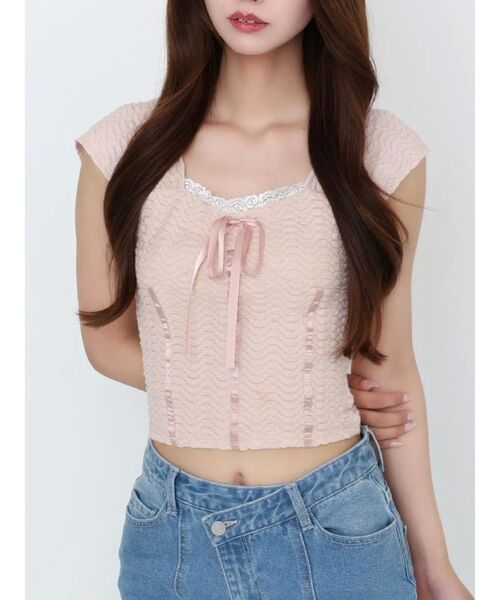 トレンドのバレエコアスタイルが叶えるトップスです。思わず触りたくなる表面にぼこぼことした凹凸感のある生地で、着こなしにアクセントをプラスしてくれます。伸縮性のある着心地もポイントです。胸元のレースとリボンがトレンドのバレエコアムードを演出します。ミニスカートに合わせてコーデするのはもちろん、今季のレースアップデニムパンツに合わせて甘すぎない大人ガーリーコーデもオススメです。----------------------------------------------♡商品のお気に入り登録完売カラーの再入荷通知や、ラスト1点、セールの通知をお知らせ致します。♡ブランドお気に入り登録新商品や再入荷など、いち早くブランドの情報を受け取ることができます。----------------------------------------------※サイズは、実寸サイズを測っているため多少誤差がでる場合があります。※重量は目安として、参考にして下さい。※商品画像は着用イメージです。 光や角度により、実物と色味が異なる場合がございます。 商品の撮影はサンプルで行っている為、カラーやサイズ等に変更がある場合がございます。 ご覧のモニター環境により実際の商品と多少色味が異なって見える場合がございます。