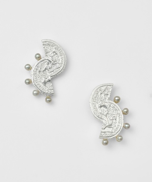 アンティークコインモチーフをセンターでスライドさせた、ユニークなデザインのピアスです。 ハードな印象のコインモチーフに、淡水パールを組み合わせることで、柔らかさと上品さをプラスしています。 グレーカラーのパールを使用することで、シルバーとのワントーン感が高まり、より洗練された印象に。 このピアスひとつで、カジュアルダウンされたスタイリングが完成します。 使い続けるうちにシルバーの風合いが変化し、パールとのコントラストが深まっていくのも魅力のひとつです。 日常使いにも取り入れやすい、個性と上品さを兼ね備えたアイテムです。 ※天然石や天然素材を使用しているものは、サイズ・色味・風合いの違いや、若干の傷、内包物の有無などに個体差があります。予めご了承ください。 ※パールは、のり留め(芯立て)ですので水分にはご注意下さい。