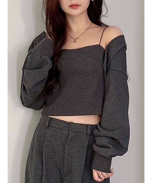 裏毛とリブ生地を使用したアンサンブルです。キャミソールはカップ付きなので1枚で着用できます。カーディガンは衿ぐりを見返し仕様にすることでカジュアルなデザインにフェミニン感を足す仕上がりになっています。後ろ裾はDカンベルト付きで三角形の開きを付けることで抜け感を出しました。左袖の金属プレートがさりげないポイントになっています。 ▼スタイリング 同じ素材のパンツとのセットアップコーディネートがおすすめです。デコルテの開いたデザインなのできらりと光るネックレスを付けるとバランスが良くなります。▼セットアップ着用可アイテムは下記品番をCHECK!002550700601【WEB限定/セットアップ着用可アイテム】裏毛センターシームパンツ▼着用レビュー【152cm / 骨格ウェーブ / イエベ春】柔らかいリブのキャミと、ふんわり袖のカーディガンのアンサンブル。軽やかな素材感が骨格ウェーブの華奢な肩まわりにちょうどよくフィットして、着るだけで“ちょっと丁寧な日常着”という印象に。短丈トップス+ハイウエストボトム合わせで重心が上がり、低身長でもバランスよく着られました◎グレーの優しいトーンは、淡色好きのイエベ春にも馴染みやすく、白やベージュのアイテムとも相性抜群。同素材のパンツと合わせてセットアップ風にすれば、今はやりの空港コーデ風に◎移動が多い日でも、快適なのに写真映えもきちんとキープできる最強アイテムです♫【158cm / 骨格ストレート / ブルベ夏】リブキャミのすっきりした縦ラインと、ストンと落ちるカーディガンの直線シルエットが、骨格ストレートのフレームにちょうどいい。首元が大きく開くデザインも、鎖骨〜デコルテの立体感を上品に見せてくれます。同素材のパンツ合わせでセットアップにすれば、パッと出かける予定があってもきちんと見えます。チャコールグレーはブルベ夏にも肌なじみがよく、シルバーのアクセを合わせて引き締めるのが◎【162cm / 骨格ナチュラル / イエベ秋】骨格ナチュラル特有の肩幅やフレーム感に対して、ドロップショルダーのゆったりカーディガンがフィット。後ろ姿に抜けを出せるバックDカンのディテールが、シンプルだけどワンテクある印象に◎セットアップで着ると上下ともに柔らかめのジャージー素材だから、休日のおうち時間や近所の買い物にも気負わず着られて便利。もちろんキラッと光るアクセやパンプスを合わせてお出かけ着にも◎肌なじみの良いチャコール寄りのグレーは、イエベ秋の落ち着いたトーンとも好相性です。~~ZOZOTOWNでお買い物を楽しむ便利機能~~♡商品のお気に入り登録完売カラーの再入荷時、ラスト1点の時、セール開始時に通知でお知らせします。予約アイテムが入荷して通常販売になった時もお知らせしてくれます!♡ブランドのお気に入り登録新商品や再入荷、セールやクーポン情報など、ブランドのお得な情報をいち早く受け取ることができます!~~~~~~~~~~~~~~~~~~~~~~~