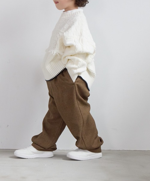【デザイン&スタイリング】 リラックス感のあるワイドストレートシルエット。 ウール調のマニッシュな素材とタックディテールがきちんと感もありつつ、抜け感のあるシルエットにする事でセットアップで着た時にこなれた印象になるのがポイント! スウェットなどカジュアルなトップスとも相性◎。 ウール調ですが、ポリエステル100%なのでしわにもなりづらく、イージーケアができるのも嬉しいポイント! 同素材のジャケットもご用意しているので是非セットアップで着て頂きたいです!(455530 【KIDS】ラナテックセーラージャケット)
