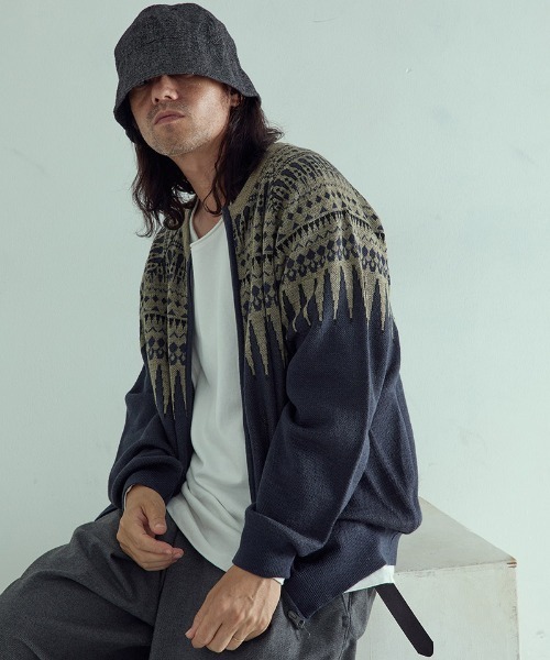 ARROWKNIT 毎シーズン1着は作りたいという想いから生まれたジャガードニットカーディガンです。 秋口から使用できるように、一般的なジャガードニットよりも薄手に仕上げながらも、存在感のある表情を実現しました。 特筆すべきは、ブランドのアイコンであるアローヘッドを用いたジャガードパターン。 このデザインが単品でも際立つ存在感を放ちます。 使い勝手を考慮したクルーネックにジップ前開きを使用することで、着脱の容易さと様々なコーディネートの可能性を広げています。 また、薄手ながらも保温性に優れたゲージ設定により、冬のインナーとしても十分な機能性を備えています。 重ね着を考慮した絶妙な厚みと、アイコニックなパターンによる洗練された印象が、シンプルなスタイルに華を添えます。 83:NV×moku.BE系 :H175cmのモデルが48サイズを着用 03:moku.BK×moku.GY系 :H175cmのモデルが48サイズを着用 32:CH×SD系 :H175cmのモデルが48サイズを着用 05:moku.CH×BK系 :H175cmのモデルが48サイズを着用