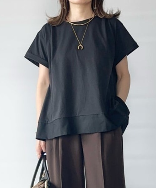""" 【人気インフルエンサー着用】 H160 M ブラック yumeさん H162 L ブルー panaさん 【お得だ値!対象】定価でもお求めやすくご用意しております。 布帛との異素材切り替えが目を引く、Aラインシルエットのカットソー。 裾にかけてふんわり広がるラインが、動くたびに軽やかな印象をプラスします。 シンプルな中にこだわりが光る一枚。 美シルエットでつくる、大人の上品カットソー 【素材】 今の季節にちょうど良い中肉素材のカットソーと、シャツの同色異素材使いをあしらいました。 【デザイン】 きれいめなTシャツが欲しい!という方にぜひおすすめなアイテム。 なぜなら、切り替えられたシャツが前から後ろまで流れるような曲線美をつくり 広めの袖口で二の腕もすっきり見せてくれ、華奢見せまでも叶うトップスだから。 背中にも切り替えを入れることで360度きれいさをキープしてくれます。 着用時にフレア感の収まりがいいように調整しました。 【ikkaポイント】 ブラウスのような品の良さと、肩の力を抜いて着られるTシャツ感覚をいいとこどり♪ 裾のシャツ素材でぱりっときれいめ感を演出しながら、晩夏まで長く着こなせる旬なカラー展開なのもポイントです。 ■スタッフ着用コメント シャツ切り替えを施すことでTシャツよりも品よく、自然におしゃれが叶います。 ボトムに細身のパンツやスカートを合わせてバランスをとるスタイリングがお気に入り。秋まで長く着られるようにと、ブラックをチョイスしました♪ ■ お得だ値 (ね)!とは? 普段より「お得な価格」で提供している商品です。 - コストダウンの取り組み - ・生産地を見直し、製造コストをダウン ・工場の閑散期に生産することで、製造コストをダウン ・オリジナル素材を開発し、素材コストをダウン 今シーズンは「値下げ」をしない安心価格です!"""