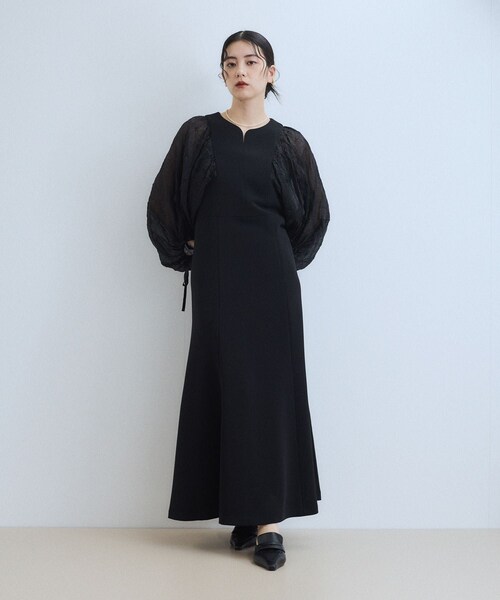 ◆2025-26秋冬◆ ADAM ET ROPE' FEMME 【Material】 身頃:落ち感があり皺になりにくい、ダブルクロス素材を使用。 袖:ワッシャー加工の入った軽やかなオーガンジー素材を使用。 【Design】 ボリューム感のあるシアースリーブが魅力的なワンピース。 袖付けのパターンや胸元の美しいカッティング、ハイウエストから緩やかに広がるマーメイドラインが大人っぽい1枚。 シアースリーブのアームホールはインナーが見えすぎない様に、ボディーに当て布が付いているのも細かいポイント。 袖口のリボンでギャザー分量の調節も可能で、サイドにポケット付き。 ※昨年にご好評いただいた(品番:GAE54500)と同型・同素材、新色追加アイテムです。 【Color】 大人っぽいブラック、配色が華やかなブラック×ブラウン、新色のネイビー×ブラックの3色展開。 【Styling Point】 サンダルやパンプスでオケージョン対応として着用したり、ブーツ合わせでデイリーに着用するのもおすすめ。 --------------- 透け感:袖のみあり 裏地:あり 伸縮性:なし 光沢感:なし 生地の厚さ:やや厚手 開き方:ファスナー ポケット:なし --------------- ◇モデル情報 身長:160cm size:38(前髪なし結びヘア) 身長:164cm size:38(ブラウンヘア) 身長:165cm size:38(前髪あり結びヘア)