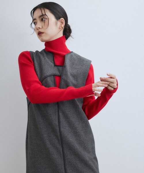 ◆2025-26秋冬◆ ADAM ET ROPE' FEMME 【Material】 カラーによって柄の異なる、薄手のツイード素材を使用。 秋から春まで着用可能なロングシーズン着回せる素材感。 【Design】 前後で違った印象で着用可能な汎用性のある2WAYジャンパースカート。 リーンシルエットに仕上げており大人っぽい印象に着こなせる一着。 キーネック側を前にして着用すると、片玉縁ポケットが前面に出ることでマニッシュな印象を感じられるデザインになっており、バックのデザインネックが素敵。その際はホックは外しての着用がおすすめ。 デザインネック側を前面にすると、パイピング切り替えによりモードな印象で着用が可能。その際の後ろのホックは留めて着用。 【Color】 ブラック×ホワイトmixのグレンチェック、ダークブラウン×ブラックmixのミニヘリンボン、ベージュ×ブラック×ボルドーのハウンドトゥース柄の3色展開。 【Styling Point】 キャミやTシャツ、ロンT、ハイゲージニットと合わせたスタイリングがおすすめ。 インナー次第でロングシーズン着用可能。 デニムやニットパンツをレイヤードするのも素敵。 --------------- 透け感:なし 裏地:あり 伸縮性:なし 光沢感:なし 生地の厚さ:やや薄手 開き方:ファスナー ポケット:あり --------------- ◇モデル情報 身長:160cm size:38(ロングヘア) 身長:165cm size:38(ボブヘア) 【素材】 ・ベージュ系(28) (表地)ポリエステル 100% (裏地)ポリエステル 100% (パイピング部分)ポリエステル 97% ポリウレタン 3% ・ブラック系(02) (表地)ポリエステル 67% レーヨン 30% ポリウレタン 3% (裏地)ポリエステル 100% (パイピング部分)ポリエステル 97% ポリウレタン 3% ・ダークブラウン(20) (表地)ポリエステル 68% レーヨン 17% 毛 13% ポリウレタン 2% (裏地)ポリエステル 100% (パイピング部分)ポリエステル 97%ポリウレタン 3%