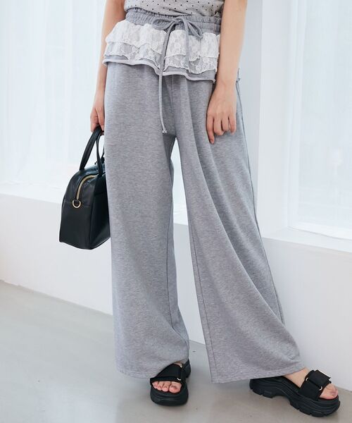 ウエストのフリルが目を惹く、今どきのスウェットパンツが登場!■デザインウエスト回りにフリルがプラスされたスウェットパンツ。フリルをレースにすることでカジュアルすぎないスウェットパンツに仕上げました。リラックス感のあるシルエットが魅力的な今シーズン1枚は持っておきたいアイテムです。■サイズ感全体的にゆとりのあるサイズ感で、リラックスして着ていただけます。ウエストはゴム仕様。ヒモが通っているのでサイズ調節が可能です。Sサイズの展開もあるので低身長さんや小柄な方も着丈を気にせずお好きなシルエットを選んでいただけます。#低身長#小柄#Sサイズ※ウエストゴム最大幅:S/100.8cm M/106cm■スタイリングルーズなシルエットなので、コンパクトなトップスと合わせるとバランス◎ウエストフリルを主役にウエストインのスタイルがおすすめです。・・・・・・・・・・・・・・・・・・・・・・透け感:なし裏地:なし伸縮性:あり光沢感:なし生地の厚さ:普通・・・・・・・・・・・・・・・・・・・・・・■商品のお気に入り登録 再入荷通知やのこりわずか、お得なプライスダウンの情報も受け取ることができます。ぜひご登録ください◎※サンプルでの撮影の為、製品と仕様が異なる場合がございます。※商品の色味は、撮影場所や光のあたり具合などにより色味が違って見える場合がございます。また、お客様のお使いのモニター環境などにより色味が異なって見える場合がございます。予めご了承の上ご注文下さい。※SサイズはWEB限定サイズとなります。
