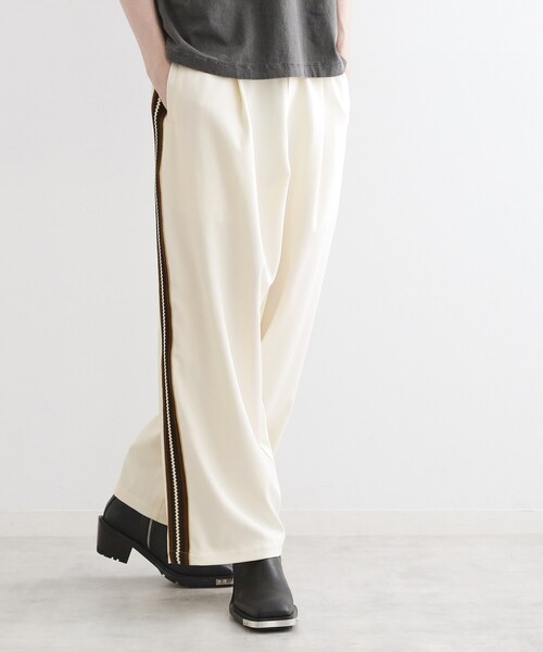 【素材】程よく肉厚なポリエステル素材を使用しています。膨らみのある素材感と滑らかなタッチが特徴です。まるでジャージのような印象ながら、実際は織物なのでジャージのようにダレすぎず、光沢感も控えめです。【デザイン】スラックスのパターンをベースに、トラックジャージパンツのディティールを載せた特徴のあるデザイン。サイドのテープはオリジナルで作成されたこだわりのデザイン。ベースのバレルシルエットを、バギーなデザインにリサイズしています。【仕様】・ポケット数:横×2 後ろ×2・裏地なし ・前ファスナー・ウエスト後ろゴム【推奨サイズ】02サイズ(M):165~175cm03サイズ(L):170~180cm※標準体型を基にした目安になります- BRAND CONCEPT -時代を超えて支持されるトラディショナルなアイテムをベースに、アソビ心とストリートの自由な発想を取り入れ、日本独自のミックススタイルを提案します。【気になる商品はお気に入り登録をおススメ】▼商品のお気に入り登録完売しているカラーの再入荷通知や、ラスト1点、セールの通知をお知らせいたします。▼ブランドのお気に入り登録新商品や再入荷など、いち早くブランドの情報を受け取ることができます。※照明の関係により、実際よりも色味が違って見える場合があります。また、パソコン・スマートフォンなどの環境により、若干製品と画像のカラーが異なる場合もございます。モデル情報:身長188cm B82 W69 H87 着用サイズ:03(L)店舗へのお問い合わせ商品番号:170-74011●製品寸法:02(M):W74cm H116cm 股下70cm 前股上31cm 渡り幅42cm 裾幅29cm03(L):W78cm H120cm 股下72cm 前股上31cm 渡り幅43cm 裾幅30cm備考: