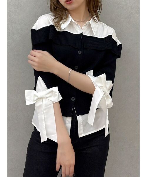 【商品】※本生産時、袖口リボン位置が3㎝程度上になります。 オフショルカーデトップスにシャツをレイヤード風にドッキングした、1枚で着映えコーデが完成するトップス。 衿のボタンは開け閉め可能。開けて抜け感をプラスしたコーデにも昇華します。 愛らしい袖リボンで女性らしさを演出しながらも、マスキュリンなシャツでトレンド感を高めてくれるアイテムです。 【スタイリング】 プリーツやバルーンスカート等のミニボトムスでプレッピー風なコーデはもちろん、 ミディスカートやデニムパンツで品の良い大人っぽさのあるヘルシーなコーデにもおすすめです。 【 お買いものにおすすめの便利機能! 】 ★商品のお気に入り登録 完売カラーの再入荷時や、ラスト1点の時、セール開始時にお知らせします。 ★ブランドのお気に入り登録 新商品や再入荷、セール情報など、いち早くブランドのお得な情報を受け取ることができます。 ぜひご活用ください。 ※実際にお届けする商品と仕様やサイズが異なる場合がございます。 また生産の都合上、お届け時期が前後する場合がございます。