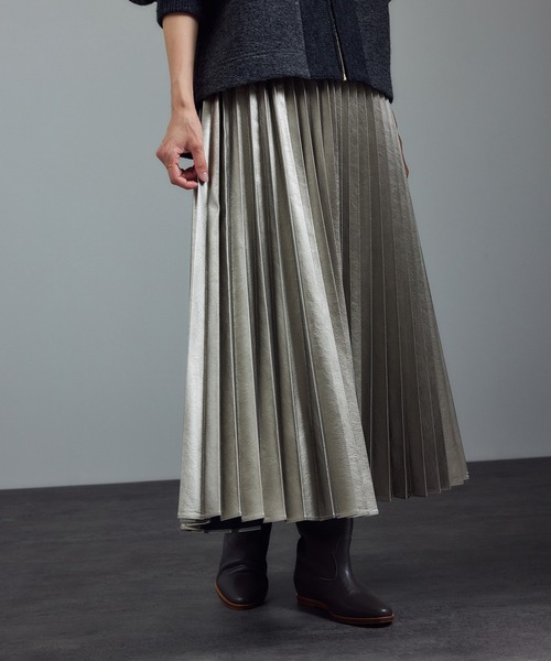 昨年大好評のシンセティックレザープリーツスカートに新色が登場。広がりすぎない美シルエットで、カジュアルからきれいめまで幅広く活躍するメタリックフェイクレザーのプリーツスカート■デザイン/シルエットメタリックなシュリンクレザー素材が目を引くプリーツスカート。甘くなりがちなプリーツをクールで洗練された印象に仕上げました。シンプルなカットソーやニットを合わせるだけでスタイリングが決まる主役級アイテム。広がりすぎない美しいシルエットは、カジュアルからきれいめスタイルまで対応し、デイリーからお出かけシーンまで活躍します。季節を問わず着回しやすく、1枚あると便利なアイテムです。※商品番号:SHC33770のアップデート品番です。生地のシボ感やウエストゴムの種類が変更となっております。■素材合成皮革ながらも本革のような重厚感と繊細なシボ感があり、アクセントとして映える表情豊かな素材。軽量で扱いやすく、レザー見えする質感でありながら快適な着用感を実現しています。ご自宅で手洗い可能なのも嬉しいポイント。■コーディネートロゴTシャツやスウェットと合わせたカジュアルスタイルはもちろん、シャツやハイゲージニットと合わせてきれいめにも。足元はスニーカーやブーツなど、その日の気分でテイストチェンジが楽しめる万能スカート。コンパクトなトップスや短丈アウターを合わせて、メリハリのあるバランスの取れたコーディネートに仕上げるのがおすすめです。■モデル身長:165cm 着用サイズ:F(ショートヘアモデル)■モデル身長:166cm 着用サイズ:F(お団子ヘアモデル)-----------------------------裏地:なし光沢感:あり透け感:なしウエスト:ゴムポケット:なし伸縮性:なし生地の厚さ:やや厚手-----------------------------