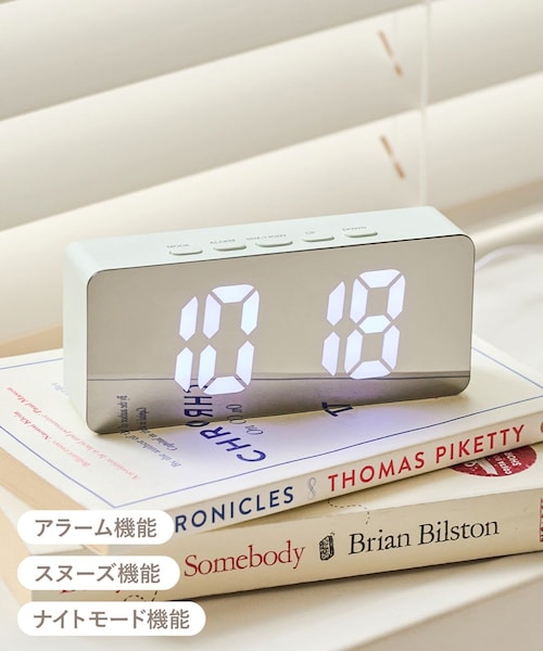 ●アラーム、スヌーズ、ナイトモード機能付きの便利な置時計です。●アラームの時刻設定をした後、(毎日・月~土・月~金)とまとめて曜日設定ができます◎●スヌーズ機能はお好きな分間隔を設定できます。●時刻のライトは2段階明るさ調整できます。●ナイトモードを設定することで、その時間帯だけ画面が少し暗くなります。●インテリアに馴染みやすいお洒落なデザインです。■仕様■内容物:時計本体、USBケーブル、取扱い説明書使用電池:単4電池×3本(別売り)基本性能:<基本表示>時間、日付、温度を表示します。 <アラーム>月~金曜日にアラーム、月~土曜日にアラーム、毎日アラームで設定できます。スヌーズ機能付き。 <明るさ調整>2段階の明るさが調整できます。 <ナイトモード>設定した時間帯に画面が暗くなります。 <電源>USB接続(DC5V1A)、単4乾電池×3本(別売り)※USB接続時はディスプレイが常に点灯します。乾電池のみでの使用時は15秒間ボタン操作がないとディスプレイが消灯しますが、いずれかのボタンを押すと再び点灯します。乾電池を併用することで、USBケーブルを抜いても各設定がリセットされないため、併用をお薦めします。《電池の出し入れ方法》<入れ方>電池はマイナス側を先に入れ、プラス側の上から押し込みます。<出し方>必ずプラス側から使用済み電池を持ち上げて抜いてください。《ご使用上の注意》●時計は精密機器です。落としたりぶつけたり強い衝撃を与えたりしないでください。●本製品の温度表示は商取引や証明には使用できません。●本製品は室内用です。日照下では正しい表示をしない場合があります。●本製品の温度は設置した場所の値を表示します。テレビなどで発表される天気予報などの温度の数値とは異なります。●直射日光の当たる場所、炎天下の車内、暖房機器の近く、その他高温多湿な場所での使用や保管、放置をしないでください。発熱・発火・やけど・感電の原因となります。●防水仕様ではありませんので湿気の多い場所を避け、水に濡らさないように注意してください。●絶対に分解や改造をしないでください。感電、故障の原因となります。●充電式の電池や、古い電池は使用しないでください。発熱、破裂、液漏れの原因になることがあります。●長期間使用しない場合は電地を本体から外してください。●USBケーブルを抜くときはケーブルを持たずに必ずプラグを持って引き抜いてください。●USBケーブルのコネクターに液体や細かいゴミなどの異物が付着した状態で使用しないでください。●使用しない時はUSBケーブルを外してください。●壁や壁紙の種類によっては色移りすることがありますので、壁と時計が擦り合わないようにご注意ください。●お手入れする場合は乾いた布で拭いてください。ベンジンやシンナー、アルコールなどの薬品や、酸性・アルカリ性の液体は使用しないでください。●LEDディスプレイがぼやけたり、音が小さくなったら電池交換してください。●本品に異常や不具合が発生した場合、電源を一度切ってから再度入れてみてください。●小さなお子様の手の届かないところに保管してください。●本来の用途以外には使用しないでください。本来の用途以外での使用が原因の損害について、弊社は一切の責任を負いかねます。●ノートパソコンなどにコードを繋いで使用する場合、出力電力及び電流により、使用できないことがあります。●本製品を使用したことによって生じた動作障害、データ損失などの障害について、弊社は一切の責任を負いかねます。●廃棄の際は、各自治体の廃棄区分に従ってください。