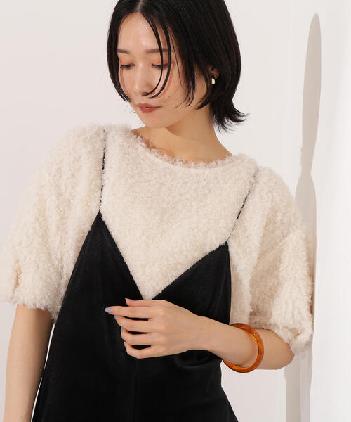 カーリーなフェイクファーがキャッチーなカットソー。やや短めでボクシーなサイズ感と、パフっとしたフォルム袖がポイント。毛足感のある素材で秋を先取りしつつ、薄手のカットソーなので暑苦しくないのも嬉しいポイントです。<素材>カールしたフェイクファーのカットソーを使用。袖はややシアー感のある裏地付き、淡色のみやや透け感があります。<詳細>仕様・後ろボタン裏地・身頃はなし、袖はあり透け感・ややあり / 光沢・なし / 伸縮性・ややあり生地の厚さ・普通●取り扱いについては、商品についている品質表示でご確認ください。●撮影はサンプル商品で行っている為、仕様とサイズが異なる場合がございます。●スタジオ及び屋外で撮影した着用画像は、光の当たり具合やご覧のモニターによって色味が違って見える場合があります。予めご了承ください。●生産時期により色・素材・サイズ感など多少異なる場合がございます。予めご了承ください。〇返品・キャンセルについて・着用・洗濯後の返品・ご交換は致しかねます。・商品到着後、着用または使用前に商品を確認して頂きますようお願いいたします。≪お買い物をよりお楽しみいただくために!≫・「商品のお気に入り登録」再入荷通知や、ラストの通知、セール通知も受け取ることができます。・「ブランドのお気に入り登録」新商品や再入荷をはじめ、タイムセールやクーポンなどいち早くブランドお得な情報を受け取ることができます。