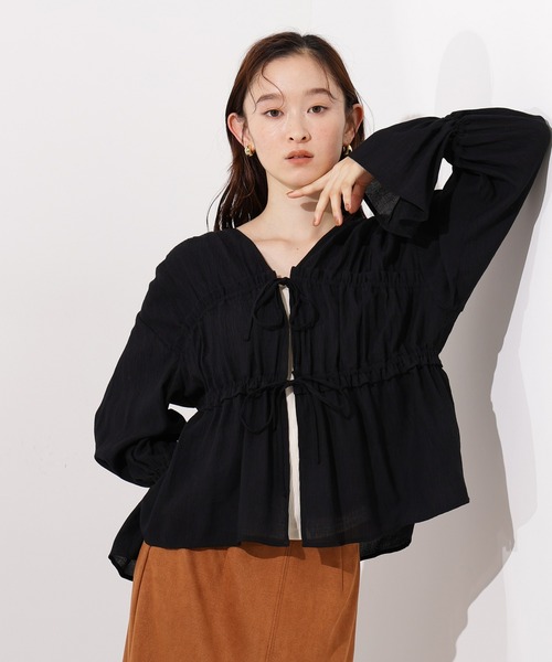 トレンドのシャーリングデザインが映える楊柳ブラウス。ビスチェのような切り替えやシャーリング、フロントリボンなど、フェミニンなディテールが細かく効いたデザインです。袖口はゴムが入り、ふんわりとしたシルエット。前を開けて羽織りとしても着ていただけます。<素材>ナチュラルでカジュアルな雰囲気の楊柳生地を使用しています。<詳細>仕様・前リボン裏地・なし透け感・ややあり / 光沢・なし / 伸縮性・なし生地の厚さ・普通●取り扱いについては、商品についている品質表示でご確認ください。●撮影はサンプル商品で行っている為、仕様とサイズが異なる場合がございます。●スタジオ及び屋外で撮影した着用画像は、光の当たり具合やご覧のモニターによって色味が違って見える場合があります。予めご了承ください。●生産時期により色・素材・サイズ感など多少異なる場合がございます。予めご了承ください。〇返品・キャンセルについて・着用・洗濯後の返品・ご交換は致しかねます。・商品到着後、着用または使用前に商品を確認して頂きますようお願いいたします。≪お買い物をよりお楽しみいただくために!≫・「商品のお気に入り登録」再入荷通知や、ラストの通知、セール通知も受け取ることができます。・「ブランドのお気に入り登録」新商品や再入荷をはじめ、タイムセールやクーポンなどいち早くブランドお得な情報を受け取ることができます。