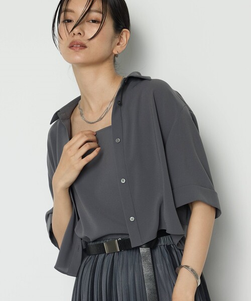 《デザイン》幅広い着こなしが楽しめるシャツとキャミソールがセットになったマルチレイヤードアイテムです。シャツONキャミや、キャミONシャツにしてレイヤードアイテムとして楽しむのも良し、単品でクロップドシャツだけで羽織にしても良し、キャミだけでジャケットのインナーにしても良しの万能アイテムです。キャミソールは肩ひもで調整が可能なので、スタイリングによって高さを変えられます。レイヤードとして使う際は長めにして重ねやすいよう、インナーとして使う際は短めにしてキッチリと着るのがおすすめです。《素材》強撚のトリアセテートとポリエステルを使用している2WAYストレッチ生地です。ドライタッチでさらりと涼やかな肌触りが特長です。あえて逆綾にしており、しなやかなドレープ性とストレッチ性がありつつも、膨らみとハリがあるので落ちすぎず上品な素材です。トリアセテートによるきれいめな光沢と繊細な織りによる凸凹で奥行きのある表情感です。お手入れ方法:手洗いOK《セットアップ》同素材のカラミパンツ(商品番号:15-06PK11-205)と合わせて、セットアップとしてお召しいただけます。※在庫がない場合もございますので、予めご了承くださいませ。
