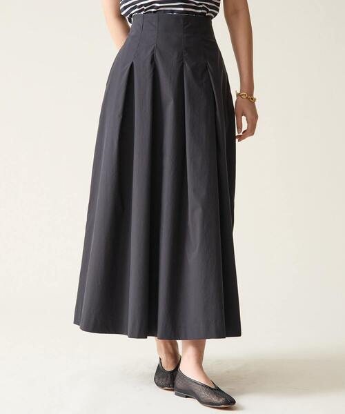タックを畳みウエスト周りをすっきりとさせたフレアスカート。 女性らしいフレアのラインはキープしながらも膨らみ過ぎずデイリー使いしやすいです。 ブラック:素材を揉み洗いをしっかり行い、樹脂加工で仕上げることで反発感ととろみを共存させたスパンライクなコットンタフタで、 撥水性とストレッチ性を備えているオールシーズン素材です。 チェック:コットンタフタのチェックをリサイクルポリエステルフィラメント糸と組み合わせて織ることで過度な洗濯シワを抑えてくれ、 細やかなシボ感を維持するノーアイロンファブリックです。