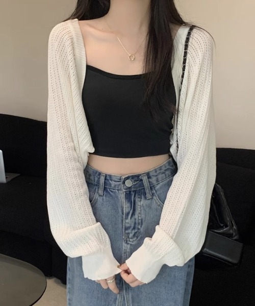 【Design-Styling】 軽やかな透け感が楽しめるショートボレロカーディガン。 透かし編みが上品な印象を与え、ボリューム袖が抜け感のあるスタイルを演出◎Tシャツやキャミソール、ワンピースの上から羽織るだけで、こなれコーデが完成します!暑い季節にサラッと羽織れる万能アイテムです! 【POINT】 ・ゆったりボリューム袖が気になる二の腕をカバー◎ ・サマーニット素材と透かし編みが、涼しげで女性らしい印象に ・クロップド丈でコーデのバランスが取りやすい ・ボトムスを選ばない着回し力抜群のアイテム ・軽くて快適な着心地で、冷房対策や日焼け対策にも活躍する1枚 ※照明の関係により、実際よりも色味が違って見える場合があります。 またパソコン・スマートフォンなどの環境や、商品画像はサンプルのため生産時期により色味や素材、 サイズ等の仕様に変更により、画像とは多少異なる場合もございます。予めご了承ください。 yuue' ★商品のお気に入り登録 完売カラーの再入荷通知や、完売間近の通知、セールの通知を受けることができます。 ★ブランドのお気に入り登録 新商品や再入荷など、いち早くブランドのお得な情報を受け取ることができます。