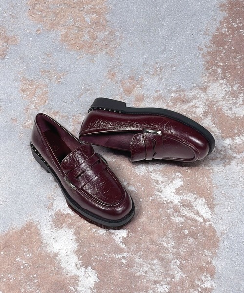 【ASH公式ショップ】2025 Autumn & Winter Collectionグロッシーレザーの厚底コインローファー。ワンカラーの艶やかなグロッシーレザーにクラッシュ加工のような仕上げを施した、上品さもあるレトロカジュアルな雰囲気の一足。定番のコインローファーのデザインを厚底、ベルトサイドとコバのシルバースタッズでエッジの効いたモードなデザインへとアップデート。スラックスやワイドパンツ、ジャケットなどのキレイめスタイルにはもちろん、スカートやワンピースのフェミニンなスタイルにソックス合わせ、またはボリュームのあるデニムやカーゴパンツのストリートスタイルでモードに合わせたりと様々なコーデを楽しんでいただけます◎シンプルなフォルムにさりげなく散りばめられたASHらしいデザイン性が魅力的なレザーローファーです。■ソール、つま先、かかと部分にはヴィンテージ加工が施されております。■天然皮革の為、色むらや軽微な傷が残っていることがあります。これらは全て革製品の特性ですので予めご了承下さい。