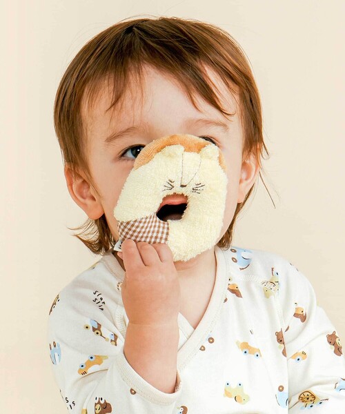 -25AW- 男の子にも女の子にも選んでほしいベビーのファーストトイにぴったりな布でできたラトル。 ■デザイン お気に入りを見つけてほしいからカラーごとに動物が異なるアイテムです。 オフホワイト:クルンとまつげのネコさん ピンク:パチンとウインクしているウサギさん ブルー:ぴょこんとおててが飛び出したペンギンさん イエロー:モクモクたてがみのライオンさん ベージュ:あどけない表情のクマさん お気に入りの動物さんはいたかな? ベージュ(クマ)は性別関係なく使えるユニセックスのデザインだから性別のわからないベビーにもおすすめ。 振るとリンリン、優しい音がなるラトル。 ドーナツ形でベビーのおててでも握りやすいのが◎ ■素材/機能 柔らかく優しい肌触りでベビーもにっこり。 一部だけ異なる生地を使用しているから手触りが違うのも面白い◎ 布製なのでケガをする心配がなく安心。 大きな音が出ないから思いっきり遊べるのも◎ ▼アニマルモチーフシリーズ 同じモチーフを使用したアイテムも展開しているから、合わせてのコーデやプレゼントもオススメです。 ※ご注意:同じカラーでも商品によってはモチーフが異なる場合がございます。 <クマ・ウサギ・ペンギンのアニマルシリーズ> 1837-75663:男の子用ロンパース(クマ・ペンギンのみ) 1837-75629:女の子用ロンパース(ウサギのみ) 1834-75615:お顔スタイ 1834-75660:おくるみ 1834-75637:ドーナツ型ラトル 1834-75648:木製歯がため 1839-75575:カップソックス 1834-75682:フワフワつみきセット <ライオン・ネコのアニマルシリーズ> 1837-75663:男の子用ロンパース(ライオンのみ) 1837-75629:女の子用ロンパース(ネコのみ) 1834-75615:お顔スタイ 1834-75637:ドーナツ型ラトル 1839-75575:カップソックス ※柄の出方は生地の裁断により一点一点異なります。 25秋冬アイテム 【2025年 7月のテーマ / Soft Windsong】 秋の優しい風がまるで子守歌のように赤ちゃんをふんわりと優しく包み込む世界。 柔らかくて優しい素材感のアイテムで赤ちゃんの時間が穏やかに流れますように。 【SLAP SLIP(スラップ スリップ)】 ~子どもの欲しいをカタチに~ ヨーロッパのこどものように 子どもらしい今しか着れないナチュラルなかわいさを提案 どこか上品で清楚感漂うフレンチカジュアルは いつものコーディネートをさりげなく格上げ
