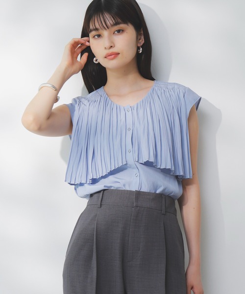 軽やかに揺れるプリーツと繊細な素材の華やかブラウス。デイリーから通勤コーデにも対応。◆2025春夏◆ <POINT> ・軽く涼し気な素材感。 ・前にデザインされた華やかなプリーツ。 ・メタルボタンできらっと! ・肩の一番上を隠す程よい袖丈。 【デザイン・シルエット】 ランダムプリーツにすることできちんと感の中にカジュアルをプラス! 通勤/オフィスカジュアルにもデニムなどのカジュアルスタイルにも合うようにしました。胸の下のラインは脇に向かってやや下がりがついているので着用時すっきり見えるようにデザインしています。短めの袖丈ですが、一番気になる肩上を隠してくれるデザイン。肌が見える部分が少ないのも嬉しいポイント。 【素材】 サラッとした素材感で、ややしぼ感があります。きちんと感も叶えカジュアルな雰囲気にも◎ 【カラー】 優し気なスミクロ(05)、アイボリーに近いキナリ(16)、サックス(48)の3色展開。 【おすすめのスタイリング】 すっきりとしたデザインなのでボトムは選ばず着用いただけます。 ボトムにインした時に目線がプリーツに行くのも華やかでおすすめです。またアウトした際はすっきりとしたIラインスカートやパンツがおすすめです。美easyシリーズのワイドスラックスパンツ(品番:BVS35100)、マーメイドスカート(品番:BVC35100)との相性もばっちり。 【モデル着用サイズ】 メインモデル身長:165cm、着用サイズ:F サックス(48)着用モデル身長:164cm、着用サイズ:F ※画像の商品はサンプルです。 実際の商品と仕様、加工、サイズが若干異なる場合がございます。 ※画像によっては実際の色味と異なる場合があります。正しい色味は生地アップ画像をご確認ください。