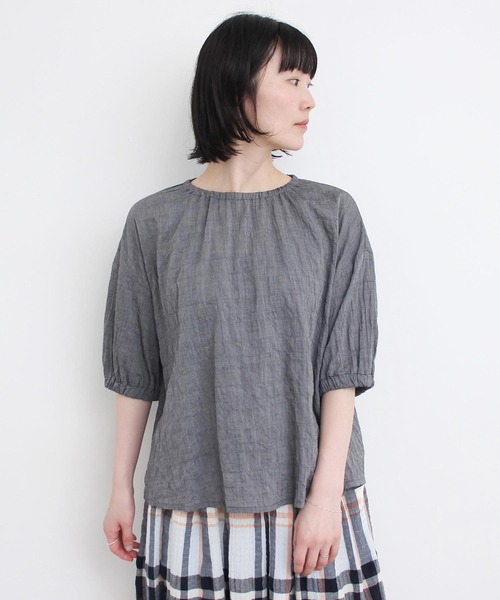 Tシャツみたいに気軽に着られるブラウス。 ふわっと軽い空気感の素材と 合わせやすいデザインで夏に大活躍します。 襟元や袖口がゴム仕様なので、 カットソーのようにすぽんと被って楽に着られるのが○ ぽこぽこと表面感のある素材で肌離れもよく 暑い季節にぴったりのアイテムに仕上がりました。 ※着用商品はサンプルです。実際の商品と仕様、加工、サイズが若干異なる場合がございます。 ※光の関係で実物の商品の色味とは若干異なる場合がございます。 実際に近い色味は詳細画像をご参照下さい。 ※取り扱いの注意については取り扱い表示をよくご確認の上、着用をお願いいたします。 【素材の特性、お取り扱いの注意】 ・独特の風合いを出すため製品洗いをしてます。一枚一枚の色味、風合い、サイズ等も微妙に違います。素材の特性上、しわが出来やすいのですが、他の製品では味わえない雰囲気をお楽しみください。 ・この製品を洗濯する際には多少縮む場合がありますので、形を整えてから日陰で干して下さい。 ・この製品は、素材の性質上特に濃色の場合汗や雨等でぬれた際に摩擦により色落ちし、他の衣料・小物に移染する事がありますので、ご注意下さい。 ・ひっかかり、ひきつれが起こり易いので、着用、着脱時には、十分注意して下さい。 ・この製品は麻の素材を使用しており、特性上シワになり易く、糸ムラ(ネップ、スラブ)やスジが入ってる場合がございますが麻の素朴さを生かしたものです。他の製品では味わえない雰囲気をお楽しみ下さい。また、お洗濯後毛羽立ちが出てくることがあります。あらかじめご了承下さい l'atelier du savon(アトリエドゥサボン) CONCEPT 1つ1つにかけられた手のぬくもり 日々の生活に、少しのデザインを加えた大人の日常着 あそび心とあたたかみ