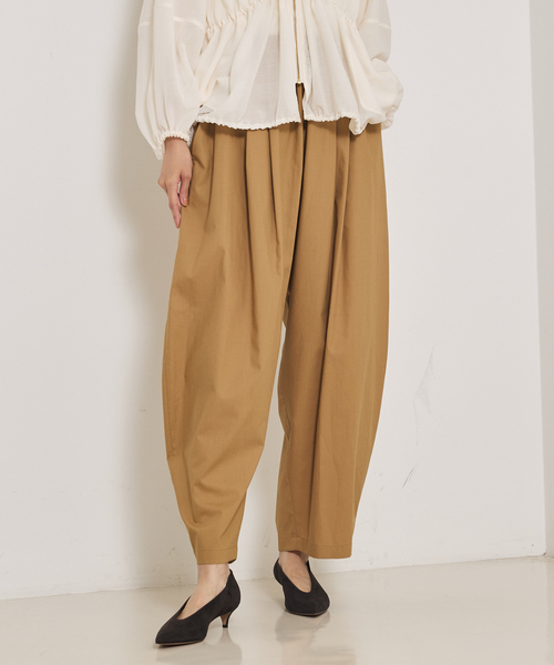 *Detail*テンセル混素材による程よい光沢感が、カジュアルながらも品のある印象を演出。タックをたっぷり入れた立体的なバレルシルエットが、動きと奥行きをプラス。傾斜カッティングで、さりげなくモード感を効かせた1本です。*Coordinate*透け感のあるトップスで軽さを出し、コンパクトにまとめた好バランスな着こなし。足元はシャープなパンプスで引き締め、全体のバランスを整えています。小ぶりのバッグを添えて、都会的で洗練された印象に◎【商品のお気に入り登録】完売カラーの再入荷通知や、ラスト1点の通知、プライスダウンしたセール通知も受け取ることができます。【ブランドのお気に入り登録】新作や再入荷等、いち早くブランドのお得な情報を受け取ることができます。