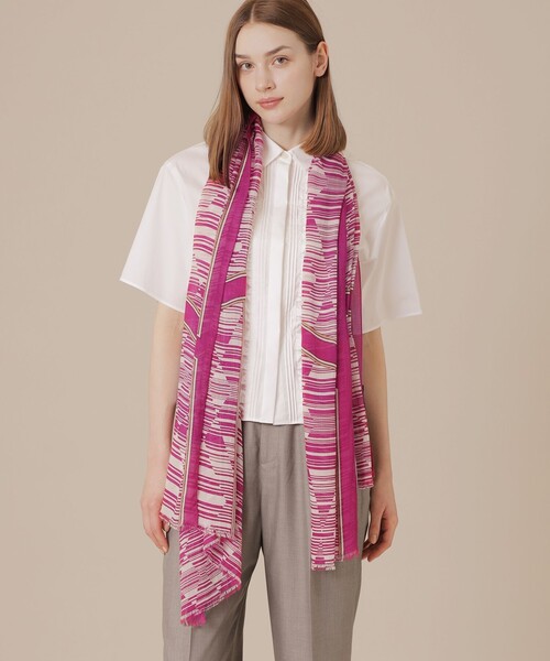 【接触冷感】 接触冷感の機能がついているジオメトリック柄のストールです。シルクのような特有の光沢感と柔らかさがあります。薄手なので長い期間お使いいただけます。繊細なプリント柄を熟練した職人が手捺染で丁寧に仕上げています。 ※この商品はサンプルで撮影を行っています。実際の商品とイメージ、仕様が異なる場合がございますので予めご了承ください。