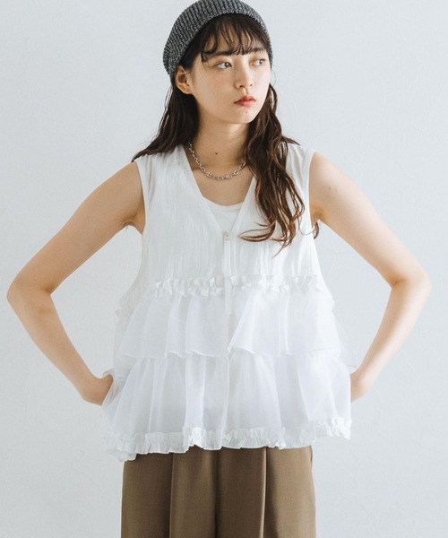 たっぷりのフリルで華やかな印象に◎ トレンドライクなフリルベスト! ■おすすめの着こなし ☆パンツスタイルには・・・ コンパクトトップス×スラックスと合わせた、きれいめスタイルが◎ ベーシックにデニムと合わせれば、ラフ過ぎないカジュアルコーデが完成します。 ☆スカートスタイルには・・・ ボリュームのあるフリルが特徴的な一着なので、Iラインスカートなどのタイトなアイテムと合わせるのが◎ ワンピースに羽織りとして使用するスタイルも、女性らしくておすすめです。 ■ポイント 普段のスタイルにプラスするだけでお洒落さがUPするフリルチュールベスト。 フロントはジップ仕様なので、着脱が簡単なのも嬉しいポイントです。 フリルデザインにはギャザーフリルも加わったので、従来のフリルベストよりも華やかさが増しています。 フロント部分は透け感の少ない生地ですが、フリル部分は程よい透け感があるので、重たい印象にならないのも◎ 他アイテムと合わせやすいベーシックなカラーバリエーションなので、着回し力も抜群なベストです。 ■素材 柔らかい肌触りで、着心地の良いレーヨンとナイロンの混紡素材を使用。 フリル部分には程よい透け感があるので、女性らしい一着に仕上がりました◎