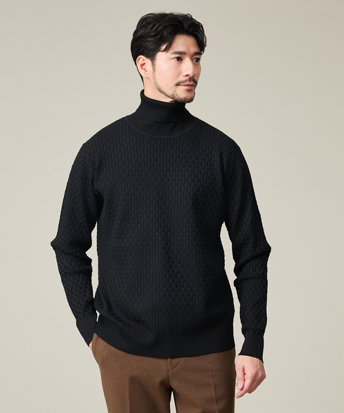 レイヤードで活きるブロックチェック柄 【素材】軽量で伸縮性があり、軽いタッチが特徴の素材を使用。 幾何学ジャガードの凹凸が肌に触れる面積を軽減してくれるので肌離れも良く快適に着用いただけます。 【デザイン】 生地に凹凸あるジャガード編みで幾何学柄を表現したニットソー。 主張しすぎない無地見えの柄で安心感を与えます。 一枚でもジャケット、アウターのインナーとしても活躍するデザインです。 【コーディネート】 綺麗目カジュアルはもちろん、ジャケットのインナー使いなどで洗練されたコーディネートが完成します。 同素材モックネック品番:71519340002 同素材クルーネック品番:71529340000 ********************** 透け感:なし 裏地:なし 伸縮性:あり 光沢感:なし 生地の厚さ:普通 クリーニング方法:洗濯機可 **********************