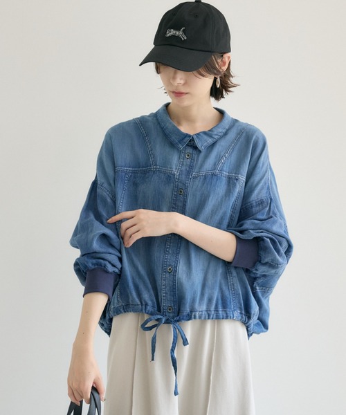 裾を絞ってシルエットで遊ぶ、新感覚の「ヴィンテージシアーシャツ」<POINT>ヴィンテージとシアーを掛け合わせたデザイン。裾のドロストで操る、自分だけのシルエット。空気のように軽やかなシアーコットン。ご自宅で手洗い可能なイージーケア性。【デザイン・シルエット】絶妙な色落ち加工が施されたヴィンテージライクな風合い、そこにほんのり肌がのぞく繊細なシアー感を融合。裾のドローストリングをきゅっと絞れば、ふんわりと丸みを帯びた立体的なコクーンシルエットに早変わり。袖口には柔らかなリブをあしらい、袖をたくし上げても落ちてこないストレスフリーな仕様。前は短く、後ろはヒップを優しくカバーする前後差のある丈感は、気になる部分を隠しつつ、どんなボトムスともバランスが取りやすい絶妙な設計。【素材感】デニム特有の重さや硬さを完全に払拭した、驚くほど薄手でシアーなコットン100%生地を採用。素肌に触れても心地よい、さらりとした質感。【カラー】ネイビー ブルー 2色展開【スタイリング】フェミニンなワンピースに重ねて甘辛ミックススタイルに。シンプルなタンクトップとワイドパンツに合わせてリラックスした休日スタイルもおすすめ。その日の気分やボトムスに合わせてお好みのシルエットを楽しんで。裏地:なし光沢:なし伸縮性:なし透け感:あり生地の厚さ:薄手ポケット:なし【Dignite collier】30代のリアルクローズを実感していただくために生まれたブランドです。SWEET x COOL CASUAL x MANNISH AGELESS SEASONLESSなど常識にとらわれない、私が着て、私らしく、私が好きになれる服。そんなアイテムを提案します。※照明の都合上、多少の色ブレが生じてしまう可能性がございますので、予めご了承くださいますようお願い致します。---------------------------------------------------●お気に入り登録でお得情報を手に入れよう!「商品のお気に入り登録」をすると、再入荷通知や、ラスト1点の通知、セールの通知など、お得情報が届きます。また、マイページでいつでも確認が可能になります。「ブランドのお気に入り登録」をすると、新商品や再入荷、などいち早くブランドの最新情報をお届けします。ぜひ、ご利用ください。----------------------------------------------------