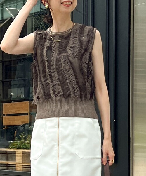 ◇25SS◇ MICO COULIER ◆Point ・秋を先取りしながら涼しく着られる、質感で魅せるシャギーベスト ・いつものコーデにプラスしてワンランクUPコーデが楽しめるアイテム! ・さらっと涼しい強撚糸に、シャギーフリンジの毛足と透け感を活かしたグラデーションデザインが魅力の1枚 ・透け感のある編地で重たく見えず、抜け感のある着こなしに ・同系色でまとめた上品なカラーリングで奥行き感があり、主張しすぎずコーディネートに馴染みます ・裾リブにはきらっとラメを織り込んで、カジュアルすぎない華やかさをプラス ・シンプルなTシャツやシャツに重ねてトレンド感をプラスしたり、ワイドパンツやロングスカートに合わせてラフな大人スタイルに ・肌寒くなったらタートルネックとのレイヤードもおすすめ◎ ・1枚着としても着られ、晩夏から秋冬までロングシーズン楽しめる季節の変わり目にちょうどいいデザインニット ・手洗い可能なイージーケア素材もポイント ---------------------------------------------------------- 透け感:ややあり 裏地:なし 伸縮性:あり 光沢感:なし 洗濯:手洗い可 ---------------------------------------------------------- ●お取扱い上のご注意● 末永くご愛用頂くために、アテンションタグを必ずご確認の上、着用又はお取り扱い下さい。 気になる商品は、お気に入り登録がオススメです! クーポン情報、入荷情報が、通知されるようになります。 ※店頭及び屋外での撮影画像は、光の当たり具合で色味が違って見える場合があります。商品の色味は、スタジオ撮影の画像をご参照下さい。 ※商品画像に関しては出来る限り忠実に表示出来るよう努めておりますが、お客様がご利用のモニターの設定及び特性により、実際の商品と比較し色味に若干の誤差が生じる場合があります。 ※製品洗い加工の商品は、多少の歪み、シワなどが見られたり、風合いやサイズ等が1枚1枚異なります。汗や雨等で濡れた時や、摩擦により色落ちし、他の衣料を汚すことがありますので(特に濃色のもの)ご注意ください。