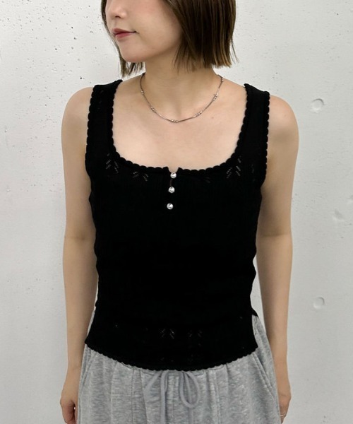 ■1枚欲しいニットタンク■針抜きの編み地が涼し気な印象のニットタンクトップ。スクエアネックでデコルテをきれいに見せてくれます。伸縮性に優れストレスフリーな着用感。胸元のボタンがワンポイントに。ヘルシーな1枚着としてはもちろん、シャツやカーディガンのインナーとしても活躍します。ーーーーーーーーーーーーーーー透け感:ややあり裏地:なし伸縮性:あり光沢感:なし生地厚さ:普通洗濯方法:洗濯可※詳しいお手入れ方法は商品についているタグをご覧くださいーーーーーーーーーーーーーーー※ご利用のモニター環境により、実際の色味と多少異なる場合がございます。… information … 欲しいitemをお気に入り登録(♡マークをclick) ・お買いのがし対策…完売itemの再入荷やラスト1点の情報をお知らせ ・欲しいitemをお得にget…pricedownになったらいち早くお知らせ ・スムーズ検索…ZOZOのお気に入りアイテムページで簡単checkできるから、再検索不要♪