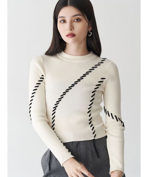 ステッチワークがアクセントに 360℃可愛いデザインニット ■アイテム トレンドのステッチワークを効かせたリブニット。 ランダムなラインのステッチが かっちりしすぎない女性らしさを演出します。 配色のステッチが目を引くポイント。 アウターを羽織ってもステッチワークが見えるので 冬のアウターコーデのアクセントになります。 コンパクトなサイズ感なので、ワイドパンツや ナロースカートなどどんなボトムにも合わせやすいアイテムです。 -------------------------------------------- 透け感:なし 生地の厚さ:普通 伸縮性:あり サイズ感:ややタイト -------------------------------------------- 【知って得する便利機能◎ 】 ■商品のお気に入り登録 再入荷時、ラスト1点の時にお知らせします。 ■ブランドのお気に入り登録 新商品やお得な情報など、いち早くお得な情報をゲット! ぜひご活用ください。 ※着用画像はフラッシュの加減で実際の製品と色味等が異なる場合がございますので、生地のズームアップ画像をご確認ください。 ※ご利用の端末画面の設定により実際の商品と色味が異なる場合がございます。