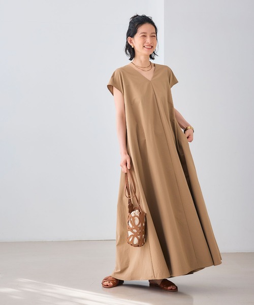 贅沢ボリュームなのに速乾◎ 夏を乗り切る優秀フレアワンピース ■エブ楽とは? Everyday 「楽」に着れるシリーズ。 365日毎日着たくなるような、着心地もお手入れも楽ちんな味方服。 《嬉しい3つの機能》 1.吸水速乾 さらりと肌離れのよい素材でストレスフリー。乾きやすいので、干す時間も短くお手入れ楽ちん。 2.マシンウォッシャブル 汗をかいても、汚れてしまっても安心。デイリー使いにぴったり。 3.UVカット UV対策機能付きで紫外線から肌を守ります。 【デザイン】 ・すぐに乾く素材を使用したイージーケアワンピ。すぐに乾いてシワも目立ちにくく、吊り干しして乾けばそのまま着れちゃうのが嬉しい! ・シンプルなディティールだからこそ際立つ、たっぷりボリュームの贅沢なフレアシルエットのバランスが絶妙な1着。 ・インナーは隠しつつも、デコルテと顔回りをすっきりと見せてくれるVネックもこだわりポイント。 ・短すぎないフレンチスリーブで肩回り・二の腕カバーも叶えてくれます◎ ・バックネックに光るゴールドボタンもさりげなくアクセントに。 ・ワンピースにあると嬉しいポケット付き。スマホはすっぽり入ります。 【コーディネート】 ・1枚でコーディネートが完成する優秀アイテム。 ・さらりと1枚での着こなしがおすすめ。気分に合わせてカラーカーデを肩掛けしたり、キャップやハットなど小物で遊んだりコーディネートを楽しんで◎ ・デイリーにもリゾートスタイルにも幅広いシーンで活躍します。 【サイズ展開】 Mサイズ Lサイズ モデル身長:162cm 着用サイズ:Mサイズ 【洗濯・取り扱い】 洗濯:洗濯可 アイロン:可 乾燥:タンブル乾燥不可 ------------------------------------- 透け感:なし 伸縮性:なし 厚み:普通 裏地:なし 洗濯:可 -------------------------------------- ※撮影時のライティング、ご覧になっているモニター・PC環境により実際の商品と色味が異なって見える場合がございます。ご了承の上お買い求め下さい。 ■商品のお気に入り登録 ラスト1点や完売カラーの再入荷、セールの通知を受け取ることができます。 ■ブランドのお気に入り登録 新商品や再入荷、ショップトピックスなどブランドのお得な情報をいち早く受け取ることができます