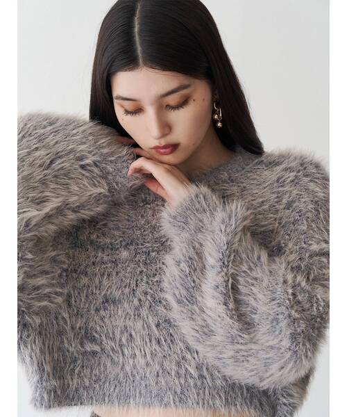 肌触り抜群のシャギーニット 2種類の糸を使っているところもポイント◎ ■アイテム 毛足の長さが違う2種類の糸をミックスして編んでおり、毛足の長さに応じて糸の色も2種類使用しています。 コントラストが出て奥行きも出るため立体感のある見た目です。 また、肌触りの良い素材感で着心地も抜群です。 身幅や袖幅にゆとりがありますが、クロップド丈のためメリハリのあるシルエットです。 合わせるボトムスをタイトなものやミニ丈にして頂き、ブーツやミディ丈のアウターを合わせて頂くとスタイルアップして着用できます。 ※編地の密度が低いニットのため、目の詰まり具合によって個体差が生じる場合がございます。 -------------------------------------------- 透け感:なし 生地の厚さ:普通 伸縮性:あり サイズ感:普通 -------------------------------------------- 【知って得する便利機能◎ 】 ■商品のお気に入り登録 再入荷時、ラスト1点の時にお知らせします。 ■ブランドのお気に入り登録 新商品やお得な情報など、いち早くお得な情報をゲット! ぜひご活用ください。 ※着用画像はフラッシュの加減で実際の製品と色味等が異なる場合がございますので、生地のズームアップ画像をご確認ください。 ※ご利用の端末画面の設定により実際の商品と色味が異なる場合がございます。