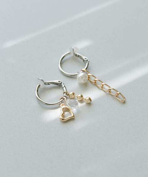 【耳元に遊び心をプラス】●左右異なるデザイン●ゴールド×シルバーのコンビカラー●揺れるチャームがアクセントハートやパール、クリアドロップなど、様々なデザインのチャームが施されたアシンメトリーデザインのイヤリング。チャームは自由に取り外しも可能なので、その日気分に合わせて雰囲気を変えて楽しめます。異素材が組み合わさった個性的なデザインが唯一無二のアイテムです。【2025 Autumn/Winter】【25AW】※メッキ製品(特に銀メッキ)は変色しやすいため、こまめなお手入れで防止してください。長期放置やスプレー香料などの同時使用は、特にお避けください。※メッキ製品は、アレルギー体質の方や体調が低下している方など、かぶれることがあります。肌に異常を感じた時はご使用をお止めいただき専門医にご相談ください。※アクセサリーは壊れやすいものです。取り扱いに注意していただき大切にご使用いただけるようお願い申し上げます。重量(片耳) : 約3g※商品画像は、光の当たり具合やパソコンなどの閲覧環境により、実際の色味と異なって見える場合がございます。予めご了承ください。※商品の色味の目安は、商品単体の画像をご参照ください。▼お気に入り登録のおすすめ▼お気に入り登録商品は、マイページにて現在の価格情報や在庫状況の確認が可能です。お買い物リストの管理に是非ご利用ください。-