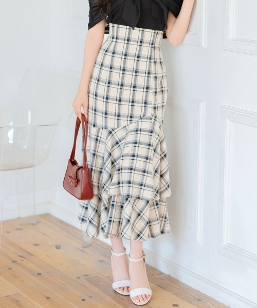 女性らしさ引き立つ、フリル×マーメイドの上品スカート【Design】・裾のティアードフリルが揺れ、華やかさを添えるマーメイドラインのスカート。・歩くたびにふんわりと広がる裾が、女性らしいしなやかさを演出します。・バックレースアップ仕様でウエストラインをきれいに見せつつ、サイズ調整も可能◎・サイドファスナー&裏地付きで、安心感のある着心地に仕上げました。・シンプルなトップスと合わせてもサマになり、こなれ感たっぷりに。・いつものコーデに加えるだけで、印象がぐっと洗練される一枚です。【Fabric】・ホワイト・ブラウンは、ポリエステル×レーヨン混のしなやかな素材感で、柔らかく落ち感のある風合いが魅力。・インディゴはややハリ感のある生地を使用し、きれいなシルエットをキープします。全カラーとも裏地付きで安心感のある着用感に。・ホワイト、ブラウン、インディゴの3色展開となります。【Care】ドライクリーニングF:(00):着丈90cm/ウエスト67cm/ヒップ95cm