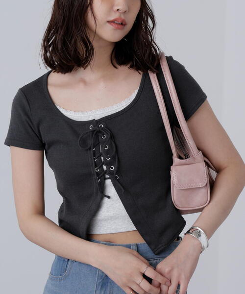 レイヤード風に見えるカットソー。コンパクトな半袖カットソーで、前のレースアップが開く仕様です。前身頃のみ脇に縫い込まれているのでさらっと1枚で着られます。インナー部分が少し短いのでヘルシーな肌見せも可能。短丈なのでハイウエストボトムスと合わせると好バランスです。より肌見せを楽しむために、ジャストウエストやローウエストのボトムスと合わせるのもおすすめです。※モデルの着用画像の場合、光の当たり具合により、実際の色味と異なって見えることがございます。色味は、商品単体の画像をご参照ください。商品特性■透け感:なし■生地の厚さ:普通■裏地:なし■伸縮性:あり■光沢:なし■シルエット:スモール---------------------------------------------------◆商品のお気に入り登録◆お気に入りアイテムの値下げ・再入荷・在庫1点などの通知を受け取ることができます。◆ブランドのお気に入り登録◆新商品や再入荷、セール、クーポン配布などお得な情報を受け取ることができます。---------------------------------------------------