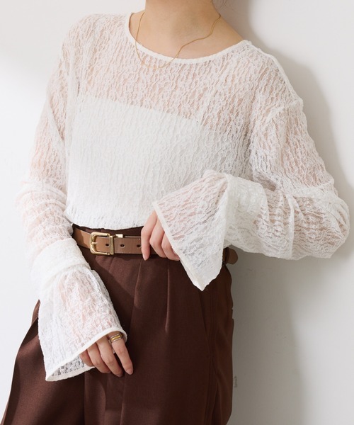スタイリングに華やかさをプラスするレーストップス【POINT】・くしゅっとした表面感のあるシュリンクレース素材を使用。・ラフな雰囲気で着られるよう、少しゆとりのあるサイズ感に仕上げました。・1枚で着映えするのはもちろん、ニットとのレイヤードスタイルも楽しめます。・取り外し可能なベルスリーブがセットになっているので着方のバリエーションも楽しめます。【おすすめコーディネート】秋にはほっこりした生地と合わせて抜け感を出すのもおすすめです。キャミワンピースやジャケットとの着回しが抜群です。【おすすめのスタイリングアイテム】・センタープレスタックパンツ CLZ1052202A0003・ロゴベルトトリコットパンツ CLZ1052202A0004【素材】本体: ナイロン90%, ポリウレタン10%カフス本体: ナイロン90%, ポリウレタン10%カフス別布部分: ポリエステル50%, レーヨン50%透け感:あり裏地:なし伸縮性:ややあり光沢感:なし洗濯:手洗い可【気になる商品は「お気に入り」登録を】 ハートマークをクリックし、お好きなカラーを選んでお気に入りに登録すると入荷情報や残り1点の通知、完売カラーの再入荷、セール情報などを受け取ることができます。※撮影場所やお使いのモニター環境により若干お色味が異なる場合がございます。特にロケの撮影では明るく見える傾向にございます。詳細撮影画像で色味をお確かめくださいます様お願いいたします。※サンプルで撮影をしております。若干の仕様が変更になる場合がございますので予めご了承の上ご注文くださいますようお願いいたします。※サンプルでの採寸のためあくまで目安となります。予めご了承ください。≪返品・交換について≫・着用後、洗濯後の返品・交換は致しかねます。・商品到着後、着用前に商品状態のご確認をお願い致します。