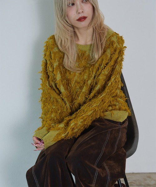 素材の魅力が際立つ、主役級デザイン■デザイン表情のあるカットジャカード素材が、着こなしの主役になるトップス。 ボーダー状のジグザグ柄ジャカード編みで、表面のワタリ糸をカットすることで、こだわりのフリンジデザインを表現しました。 お手持ちのボトムスに合わせるだけで、トレンド感溢れる旬のコーディネートを作り出します。同素材のカーディガン(61-15-1227-370)もございます。■コーディネートデニムパンツやカジュアルなアイテムと合わせるのがおすすめ。今年らしい抜け感のあるスタイリングが楽しめます。厚みを抑えたデザインなので、ボトムスインもしやすく、コートのインナーとしても活躍します。■サイズゆったりとした着心地でありながら、クルーネックで首元はすっきり。計算されたサイズ感で、リラックスしつつも上品な印象を与えます。■素材フリンジジャカードの立体感あるポリエステル素材。■ケア方法ドライクリーニングのみ可(詳細は商品についている品質表示ラベルをご覧ください)【OFF WHITE・YELLOW】BEAMS STAFF:H164 Size:ONE SIZE【BLACK】BEAMS STAFF:H163 Size:ONE SIZE生地の厚さ:厚手透け感:なし伸縮性:あり光沢感:なし裏地:なし【スタッフレビュー】スタッフ:カタヤマ アヤ身長:155cm / 普段サイズ:0 / 着用サイズ:ONE SIZEサイズ感: 身幅ゆったりめ。丈は長すぎず、短すぎずちょうどいい長さです。素材感: ふわふわした触り心地。チクチクしないので着心地◎ポイント: 毛足の長いフリンジでボリューム感が出せます!ボトムスはスッキリした物を選ぶとバランス取りやすいです。※光の当たり具合やパソコンなどの閲覧環境によって、実際の色味と異なって見える場合がございます。予めご了承ください。※商品の色味は商品単体で撮影した画像をご参照ください。