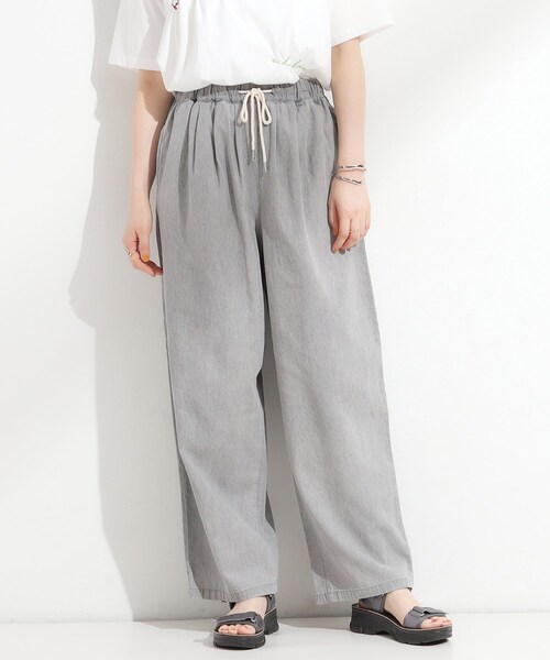 【デザイン】 暑い夏も快適に着用できるデニムワイドパンツ。 単なるワイドシルエットではなく、ややカーブシルエットでこなれ感をアップ。 ウエストは総ゴム仕様、紐で調整可能で楽に着ていただけます。 【スタイリング】 脚のラインを拾いにくいワイドシルエットなので、 短丈やミドル丈のトップスをチョイスするとバランスよく決まります。 プリントTシャツとの着こなしはもちろん、 ギャザーやフリルなどフェミニンなディテールのブラウス合わせで上品な印象にも着ていただけます。 フロントインすると上半身がコンパクトに見えてバランス良く着ていただけます。 インせずに着ていただくと、今っぽいゆるカジュアルスタイルに。 【素材】 ナチュラルな色落ち感の加工を施した、 ライトオンス(軽い)で、見た目以上に柔らかく薄い生地感のデニム素材を使用しています。 【仕様】 ・ポケット数:横×2 ・ウエスト総ゴム ・裏地なし ※照明の関係により、実際よりも色味が違って見える場合があります。また、パソコン・スマートフォンなどの環境により、若干製品と画像のカラーが異なる場合もございます。 モデル情報:身長165cm B82 W60 H88 着用サイズ:02(M) 店舗へのお問い合わせ商品番号:C62-63016 ●製品寸法: 01(S):W62~107cm H117cm 股下69cm 前股上27cm 渡り幅37cm 裾幅24cm 02(M):W69~112cm H120cm 股下70cm 前股上28cm 渡り幅39cm 裾幅25cm 03(L):W74~117cm H123cm 股下71cm 前股上28cm 渡り幅41cm 裾幅26cm 04(LL):W79~122cm H126cm 股下72cm 前股上29cm 渡り幅43cm 裾幅27cm 備考: