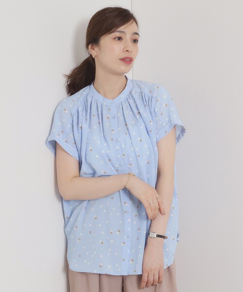 【デザイン】カジュアルからきれいめスタイルまで幅広く活躍。さらりと着られる前開きデザインのきちんと見えブラウス。ONからOFFまで幅広いシーンで活躍する幾何学柄デザインのブラウス。ポリエステルジョーゼット素材で、さらりとした肌触りの軽い着心地。ギャザーを寄せてふんわり仕上げた、程よいゆとり感のあるデザインが涼し気。前開き仕様で羽織としても着用可能なので、着回し力も優秀。バンドカラーにターンバック風の袖デザインできちんと感があり、夏のオフィスシーンにもおすすめの好印象ブラウスです。【素材】さらりとした肌触りのポリエステルジョーゼット素材。※照明の関係により、実際よりも色味が違って見える場合があります。また、パソコン・スマートフォンなどの環境により、若干製品と画像のカラーが異なる場合もございます。----------------------------------------★お気に入り登録がおすすめ★▽気になる商品はハートマークをクリック!・再入荷やセールの通知をお知らせ・お気に入り一覧からいつでもチェック▽ブランドのお気に入り登録も!・新商品やお得な情報をいち早くお知らせ----------------------------------------モデル情報:身長165cm B82 W60 H88 着用サイズ:00(フリーサイズ)店舗へのお問い合わせ商品番号:P93-52549●製品寸法:00(フリーサイズ):着丈64cm B116cm 裄丈33cm備考: