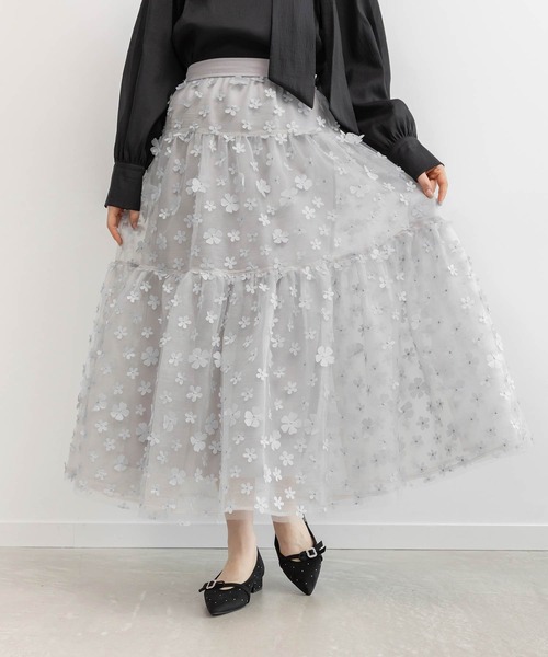◆2025AW新商品◆ 今季注目の3Dフラワー素材を贅沢に使用したティアードスカート。 ふんわりとしたシルエットに立体感のある装飾で、フェミニンムードたっぷりなアイテムです。 POINT ・何層にも重ねた生地で表情のあるフレアスカート ・一番上の生地にはシアー感のある3Dフラワーが施された生地を使用 ・たっぷりと取ったギャザーでボリューム感を出しつつも、ウエストをすっきりさせメリハリのあるスタイルに ・ウエストはゴム入りで着用しやすいのも嬉しいポイント COORDINATE ショートのニットカーデやジャケットとのコーデで、カジュアルフェミニンなスタイリングがおすすめです。 - - - - - - - - - - - - - - - 洗濯方法:家庭洗濯不可 透け感:ややあり 裏地:あり 伸縮性:なし 生地の厚さ:薄手 - - - - - - - - - - - - - - -