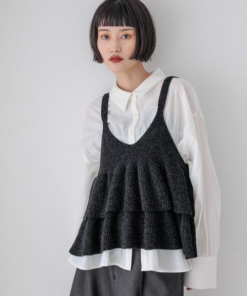 ■素材■ トレンドのレベロアのような見え方が特徴のモール糸を使用したニットベスト。 肌触り滑らかで気持ちのよい風合いです。 ■デザイン■ 今年トレンドのペプラムディテールのニットベスト。 どんなインナーにも合わせやすい映えアイテムです。 Tシャツやブラウスの上から着用することで、暑い時期の単調になりがちなコーディネートのポイントになるアイテムです。 ■スタイリング■ インナーと合わせてお召しいただくと冬から春先までシーズンをまたいで活躍できるアイテムです。 .